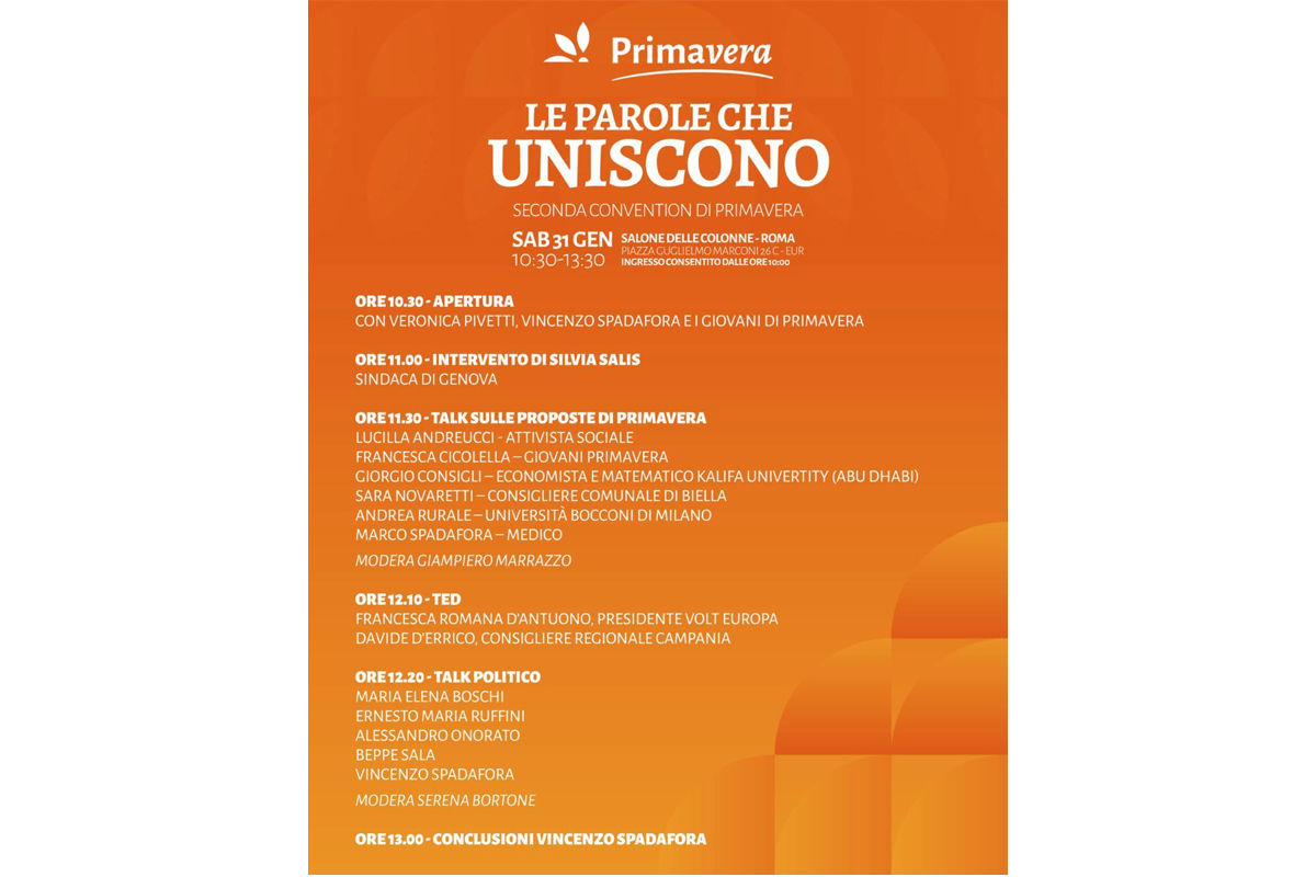 Saranno presenti, tra gli altri, Ernesto Maria Ruffini fondatore di Più Uno, la sindaca di Genova Silvia Salis, il sindaco di Milano Beppe Sala, Maria Elena Boschi capogruppo Italia Viva alla Camera, Alessandro Onorato fondatore di Progetto Civico Italia, insieme a tanti rappresentanti del mondo istituzionale, associativo, imprenditoriale e amministrativo che negli ultimi mesi hanno dialogato con Primavera sui temi sociali, economici e civili al centro della sua proposta.