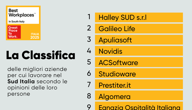 Best Workplaces in South Italy 2025, ben 4 aziende premiate hanno la sede in Puglia: si tratta di GalileoLife (Maglie); Apuliasoft (Bari) Algomera (Brindisi); Egnazia Ospitalità Italiana (Fasano).