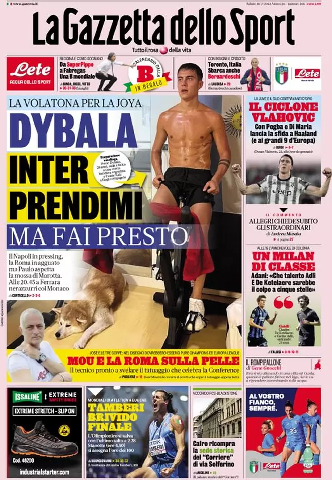 Prime pagine giornali sportivi 16 luglio. Dybala preme l'Inter, arriva Bremer