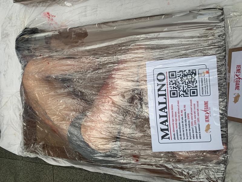 Due attivisti coricati e impacchettati in simil vaschette del supermercato sono a simboleggiare una parte di vitello e di maiale in vendita