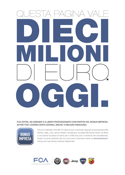 Con “bonus impresa” il gruppo FCA, insieme alla sua rete di vendita italiana, dimostra, ancora una volta, come sia una realtà fatta di professionisti al servizio di professionisti con offerte concrete e modelli per qualunque esigenza.