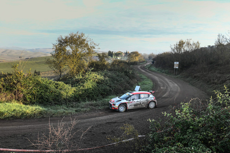 I 2,05 km sulle strade di San Giovanni d’Asso che hanno dato il via all’ultimo round della stagione del CIR, hanno visto la coppia Citroen Italia composta da Luca Rossetti ed Eleonora Mori concludere senza preoccupazioni il terza posizione, a pari merito con il secondo di giornata Simone Campedelli su Ford Fiesta R5 EVO 2 del team Orange 1.