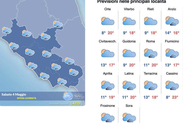 Meteo Roma 4 maggio: piogge e temporali isolati con annesse grandinate improvvise vanno in archivio. Si apre una fase di tempo stabile e soleggiato accompagnato da qualche nuvola e con la massima in rialzo con picchi di 24 gradi. Tempo, insomma, normale per la stagione.