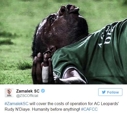 N'Diaye è stato ricoverato in un ospedale del Cairo per essere operato al collo, ma si teme che possa rimanere affetto da quadriplegia, la paralisi del busto e dei quattro arti. Il club egiziano avversario dello Zamalek attraverso il proprio profilo Twitter ha fatto sapere che "coprirà i costi dell'operazione. Umanità prima di tutto".