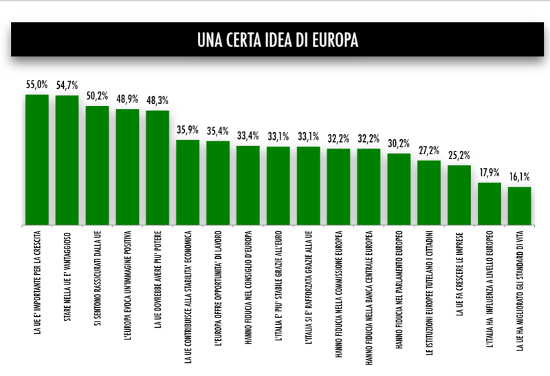 In generale per gli italiani stare nell'Ue è vantaggioso (lo pensano il 55% degli intervistati), ma non si sa bene per che cosa visto che solo il 16,1% ritiene che il suo standard di vita sia migliorato grazie all'Unione. Non c'è dunque alcuna percezione di tutti i passi avanti fatti in settori come la sicurezza alimentare, il commercio, i diritti dei consumatori e la protezione ambientale.