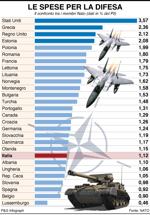 Donald Trump appare determinato a fare pressione sugli alleati più recalcitranti ad onorare l'impegno preso nel 2014, quello di portare le spese per la difesa ad un livello pari al 2% del Pil entro il 2024. Tra i più riottosi c'è la Germania, che spende l'1,24% (stima per il 2018, diffusa oggi dalla Nato), ma anche l'Italia, all'1,15%, per non parlare di Spagna e Belgio, entrambe allo 0,93% e del ricco Lussemburgo, il Paese di Jean-Claude Juncker, fermo allo 0,55%. Anche l'Ungheria del nazionalista Viktor Orban (1,08%) e la Repubblica Ceca del populista Andrej Babis (1,11%) sono nella lista dei 'reprobi'.