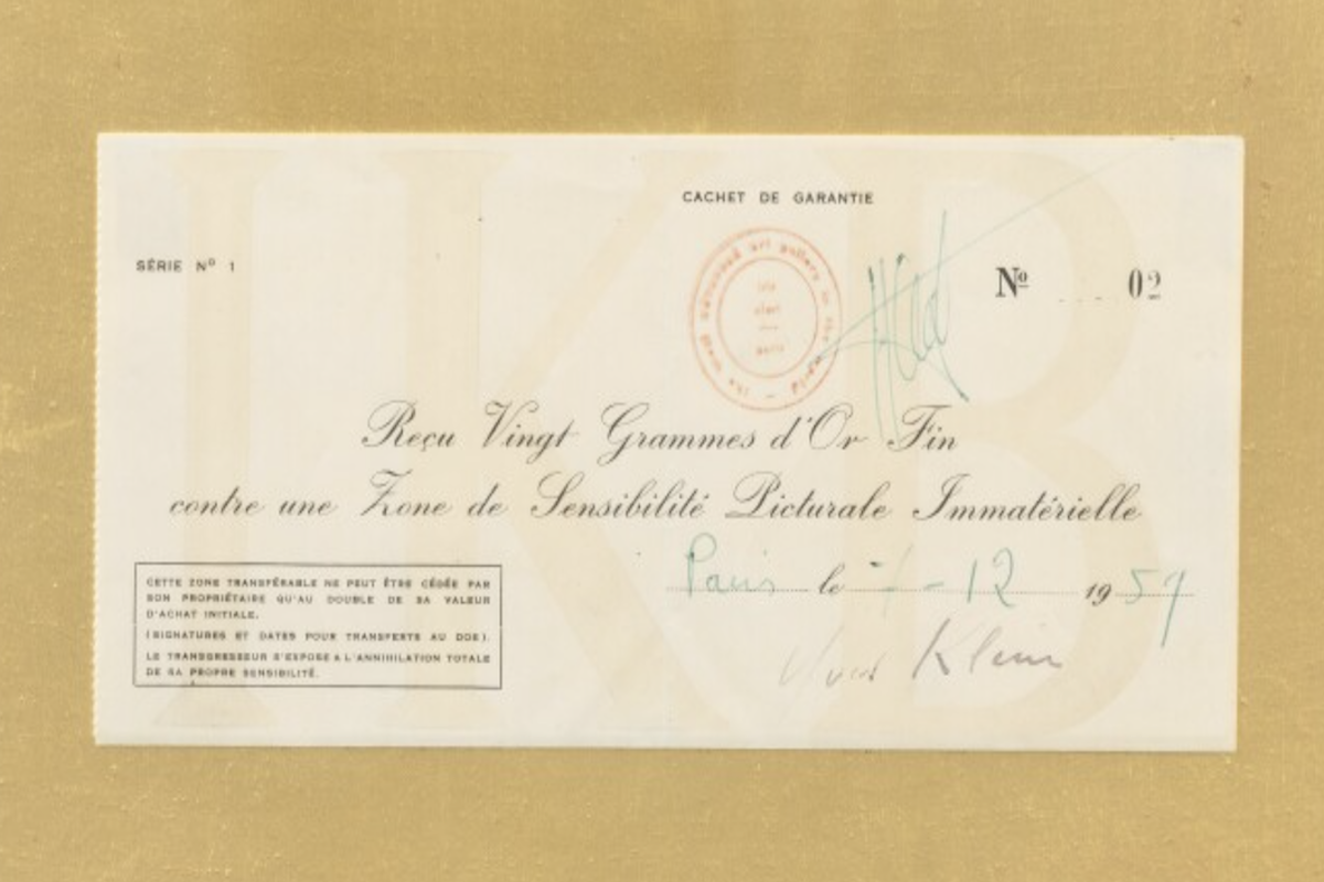 Un milione di euro. Questa la cifra di aggiudicazione realizzata a Sotheby’s Parigi, lo scorso 6 aprile, da “Zone de sensibilité picturale immatérielle”. opera d’arte immateriale realizzata dal grande Yves Klein nel 1958. L’acquirente, che, per la precisione, ha pagato 1.063.000 euro, il doppio della stima massima stabilita dalla “maison d’enchère” francese (300.000 -500.000 euro), di “fisico” porta a casa soltanto la ricevuta che garantisce la proprietà di un lavoro invisibile.
