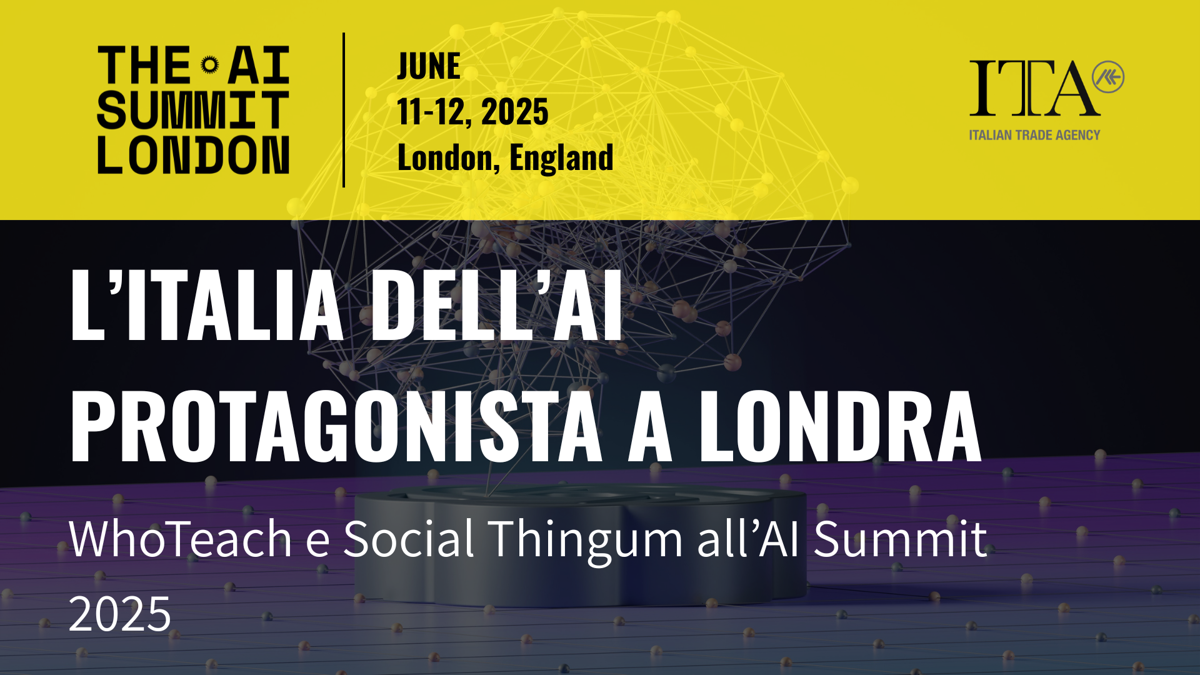 Le realtà italiane WhoTeach e Social Thingum parteciperanno all’AI Summit 2025 di Londra fra l’11 e il 12 giugno 2025, evento internazionale dedicato all’intelligenza artificiale applicata al business, che si terrà presso il Tobacco Dock. La loro presenza è resa possibile grazie al supporto dell’ITA – Italian Trade Agency, che coordina il padiglione italiano all’interno della manifestazione.