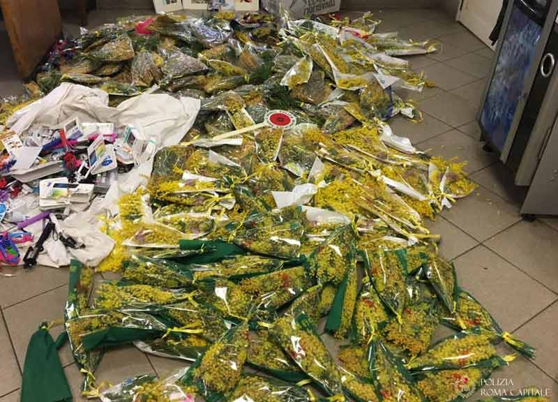 Tra Via Nazionale, Piazza di Spagna, Piazza Navona, Viale Aventino e Via Marmorata, tre pattuglie hanno sequestrato 713 ramoscelli di mimosa, “strappati” al commercio illecito perpetrato da cittadini bengalesi, alcuni dei quali fuggiti alla vista delle pattuglie.