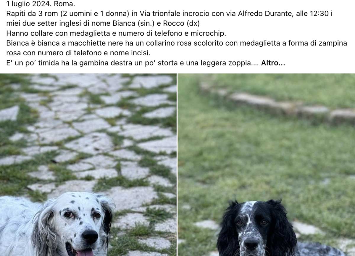 Lunedì 1 luglio la seconda segnalazione: scrive Tiziana P: “Rapiti da 3 rom, 2 uomini e 1 donna in Via trionfale incrocio con via Alfredo Durante, alle 12:30 i miei due setter inglesi di nome Bianca (sin.) e Rocco (dx). Hanno collare con medaglietta e numero di telefono e microchip”.