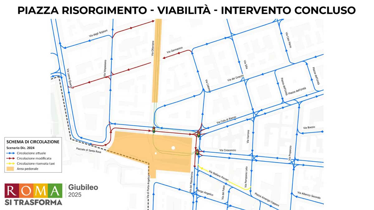 ale piano vedrà un nuovo assetto della viabilità, stile piazza Cavour, con una circolazione veicolare a doppio senso di marcia su tre tronchi (lato viale Bastioni di Michelangelo, lato via Ottaviano e lato via Crescenzio), al posto dell’attuale struttura rotatoria. Nel nuovo piano di mobilità, le manovre di svolta saranno regolate dagli impianti semaforici presenti in piazza Risorgimento, nelle intersezioni con via Cola di Rienzo, via Crescenzio e via Ottaviano. Sia nella fase provvisoria di viabilità, sia in quella definitiva, sarà necessario prestare attenzione alla nuova segnaletica presente.