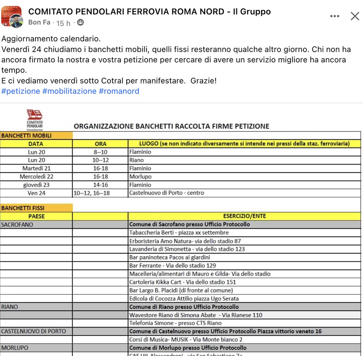 In chiave moderna e eco, la protesta è stata organizzata via Fb, direttamente sule pagine Pendolari Ferrovia Roma-Nord quasi 5 mila follower con la solidarietà del “Comitato pendolari Roma- Il trenino”, il gruppo di 10 mila vittime dell’altra ferrovia ceduta dal Comune di Roma ad Astral e Cotral.