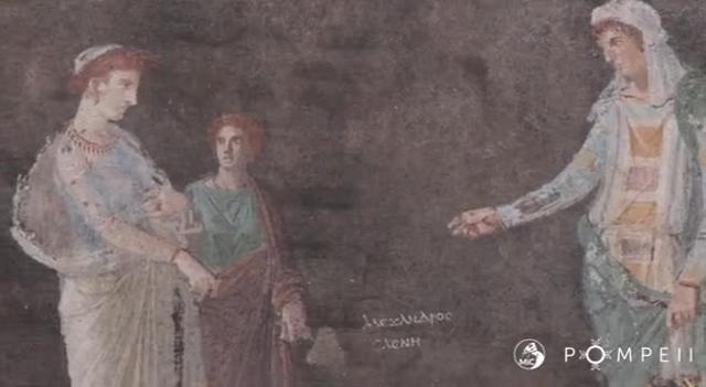 Pompei (Na), 11 apr. (askanews) – Un imponente salone da banchetto, dalle eleganti pareti nere, decorate con soggetti mitologici ispirati alla guerra di Troia, è uno degli ambienti recentemente portati alla luce durante le attività di scavo in corso nell’insula 10 della Regio IX di Pompei e oggi completamente visibile in tutta la sua maestosità. “Le pareti erano nere, per evitare che il fumo delle lucerne si vedesse sui muri. Qui ci si riuniva per celebrare dei banchetti dopo il tramonto e la luce tremolante delle lucerne faceva rivivere le immagini, erano delle occasioni per parlare del passato, del mito, ma anche delle persone che stavano qui. Vediamo Elena e Paride, chiamato Alessandro nell’iscrizione, con un altro nome, era un’occasione per parlare dell’amore, della coppia, ma anche della grande storia che coinvolge questi due, che sono la causa, o anche solo il pretesto, della guerra di Troia”, ha spiegato il direttore del Parco archeologico Gabriel Zuchtriegel, aggiungendo che “oggi noi tutti siamo un po’ Elena e Paride. Nel senso he possiamo decidere di vedere solo la nostra piccola vita o vedere come questa vita si intreccia con la politica, con la società”.Oltre a Elena e Paride, indicato in un’iscrizione greca tra le due figure con il suo altro nome “Alexandros”, appare sulle pareti del salone la figura di Cassandra, figlia di Priamo, in coppia con Apollo. “Pompei è davvero uno scrigno di tesori che non finisce mai di sorprenderci e di destare stupore perché, ogni volta che scaviamo, troviamo qualcosa di bello e di significativo. Noi crediamo in questo unicum mondiale che rappresenta Pompei e per questo in legge di Bilancio abbiamo finanziato nuovi scavi”, ha sottolineato il ministro della Cultura, Gennaro Sangiuliano.