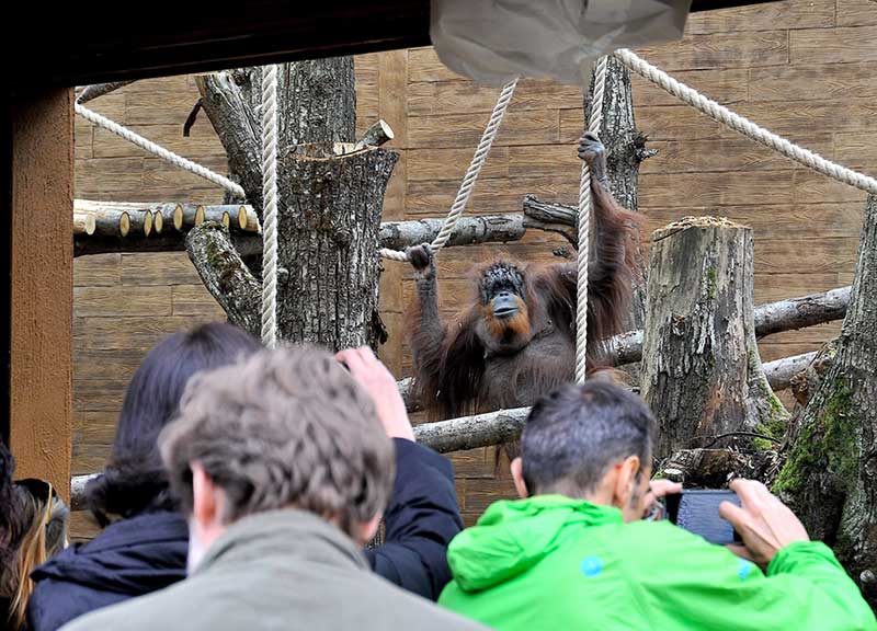 Grandi vetrate consentono al pubblico una vista molto ravvicinata di queste grandi scimmie antropomorfe delle foreste asiatiche. All’interno dell’area, gli oranghi, hanno a disposizione tronchi, corde e piattaforme in legno per muoversi, riposarsi e creare il nido, proprio come accade in un ambiente naturale”.