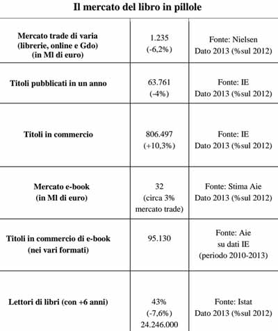 Il momento difficile continua, anche se il mondo del libro non si esaurisce nei segni meno. Esiste infatti un altro scenario: cresce il mercato degli e-book in termini di titoli disponibili (40mila nel solo 2013) e di quota di mercato (tra il 2,7% e il 3,0% riferita ai canali trade 2013). La filiera si rinnova nei prodotti e si internazionalizza; accoglie le opportunità che il digitale le offre, nei processi e nei prodotti. Percorre (da sola) nuove strade per la promozione della lettura e per allargare il mercato (o semplicemente per cercare di far sì che quel mercato non si restringa ulteriormente). Le librerie esplorano nuove formule (l’integrazione con il food ne è un esempio) per rispondere a un cliente che integra librerie fisiche con store on-line, letture di pagine con letture di pixel.
