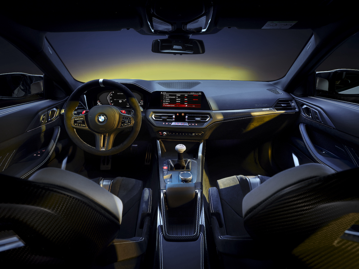 L’abitacolo della BMW 3.0 CSL si caratterizza per l’uso del carbonio e di altre misure di costruzione leggera sottolineano le caratteristiche da auto sportiva pura. Al posto dei sedili aggiuntivi, la parte posteriore offre un vano portaoggetti con due scomparti per caschi integrati. Anche le finiture in CFRP nei pannelli delle porte e l’isolamento acustico ridotto contribuiscono a conferire un tocco estremamente sportivo. Il guidatore e il passeggero anteriore siedono su sedili full bucket M Carbon