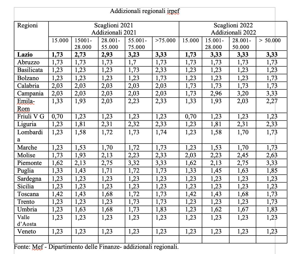 Il sindacato osservi bene la tabella allegata per capire che la Regione Lazio ha il massimo delle aliquote Irpef, e questo con la giunta di sinistra.