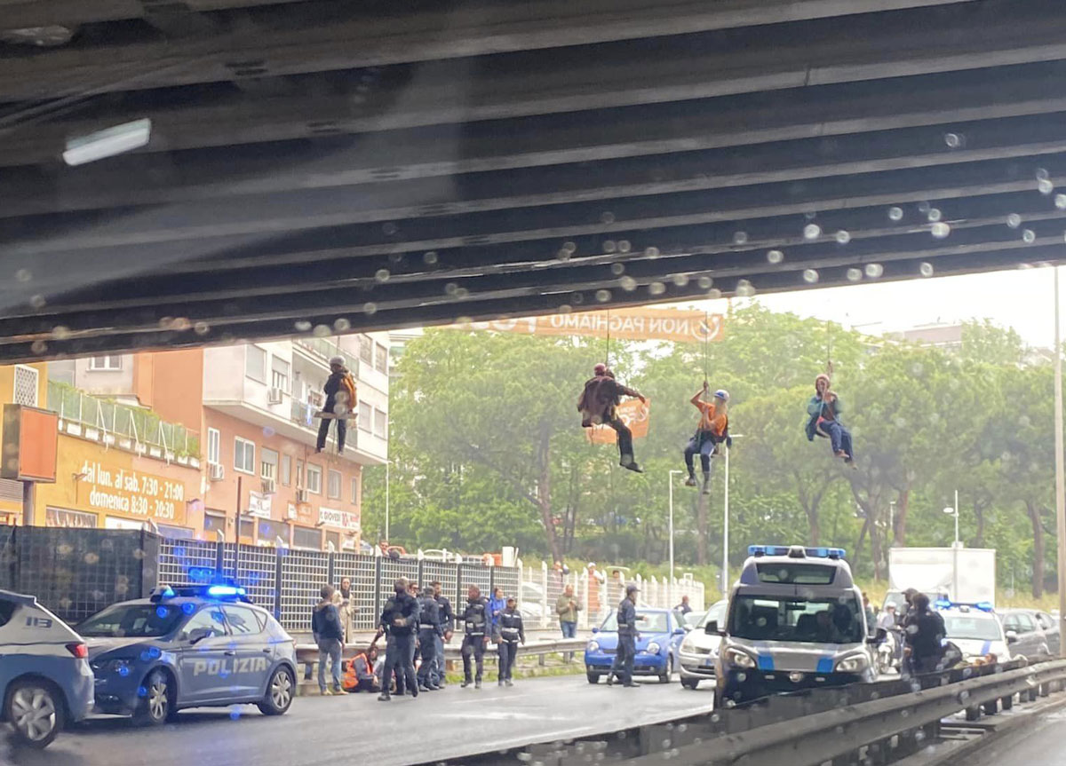 Quattro attivisti di ‘Ultima Generazione’ si sono appesi, utilizzando corde da roccia, da ponte delle Valli calandosi sulla Tangenziale in direzione San Giovanni