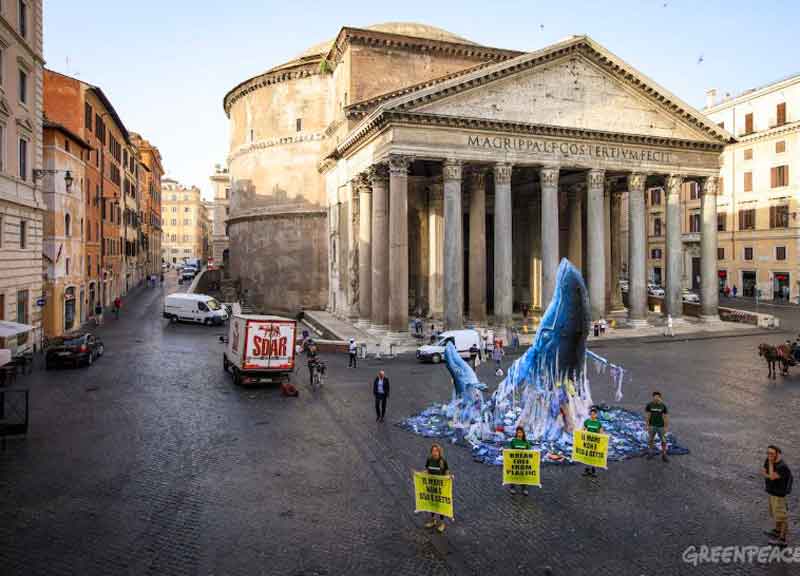 In pieno centro a Roma, davanti al Pantheon, due grandi balene, alte rispettivamente 6 e 3 metri, emergono da un mare invaso da rifiuti in plastica monouso. Gli attivisti di Greenpeace hanno montato una riproduzione a grandezza naturale dei due cetacei, per denunciare come i nostri mari e le specie che li abitano siano in grave pericolo a causa dell’uso smodato di plastica usa e getta, e dell’inquinamento che ne deriva.
