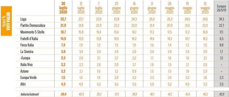Lega e Pd sono quasi a contatto nel sondaggio dell’Istituto Ixe’ per Carta Bianca, di Raitre (periodo di rilevazione, dal 28 al 29 luglio 2020). Il Carroccio di Salvini arretra dell’1% e scende al 22,7%. Il Partito Democratico di Nicola Zingaretti prende lo 0,1% e sale al 21,9%. La differenza Lega-Pd è dello 0,8%.