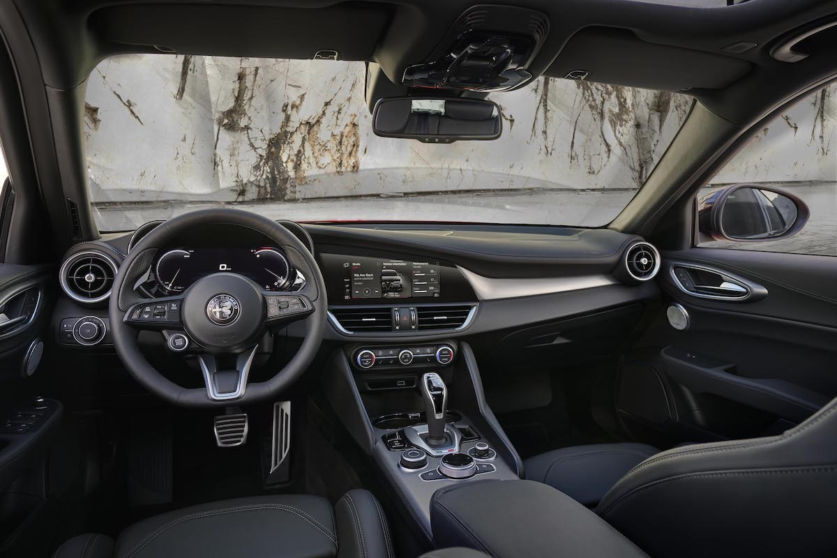 Anche il layout dei gruppi proiettori posteriori a LED, perfetta combinazione tra stile e tecnologie sofisticate, si rinnova al fine di accentuare l’anima sportiva di entrambi i modelli. In dettaglio, la Nuova Stelvio presenta nuovi gruppi ottici posteriori con vetro fumé e finitura nero lucido mentre quelli della Nuova Giulia adottano vetro e finitura trasparente. Il quadro strumenti è caratterizzato dallo storico design “a cannocchiale”, dove campeggia il nuovo schermo TFT da 12,3” - totalmente digitale - da cui accedere a tutte le informazioni sulla vettura e ai parametri relativi alle tecnologie di guida autonoma. Inoltre, il cluster può essere riconfigurato attraverso tre layout: “Evolved”, che rappresenta la visione progettuale delle Alfa Romeo del futuro valorizzando l’area centrale dello schermo pur mantenendone i 2 quadranti laterali; “Relax”, con un focus specifico sul comfort, libero da dettagliate informazioni vettura e caratterizzato dall’ assenza dei 2 quadranti; e infine “Heritage”, che si ispira ai modelli iconici del marchio degli anni 60 e 70, con dettagli distintivi come i numeri invertiti sull'estremità finale del tachimetro. Il comportamento dinamico impeccabile e sportivo di Giulia e Stelvio è supportato dall’impiego diffuso di materiali ultraleggeri, come l’alluminio utilizzato ad esempio per la base dei motori e il carbonio, utilizzato per l’albero di trasmissione, soluzione derivata direttamente dal mondo delle competizioni. Il sistema gestisce la trazione del veicolo in modo reattivo e predittivo, al fine di garantire il massimo livello in termini di prestazioni, efficienza e sicurezza in ogni condizione di guida.