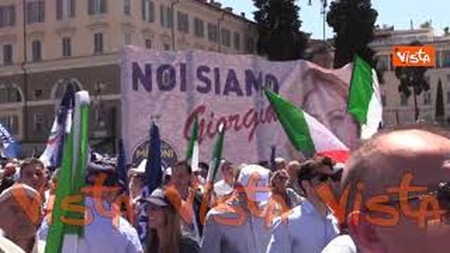 Si è tenuta in piazza del Popolo a Roma la grande manifestazione per la chiusura della campagna elettorale per le europee di Fratelli d’Italia. Al grido di “Con Giorgia l’Italia cambia l’Europa”, migliaia di persone si sono riunite davanti al palco con bandiere e cartelli. “Noi siamo Giorgia Meloni” dice uno dei cartelli. “Un solo nome, un solo cognome: Giorgia Meloni”.