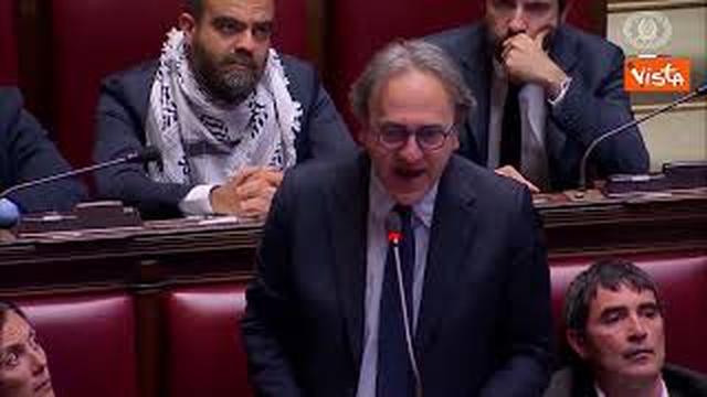 Il deputato di Avs Marco Grimaldi con la kefiah palestinese in Aula per il Premier Time della Presidente Meloni alla Camera.