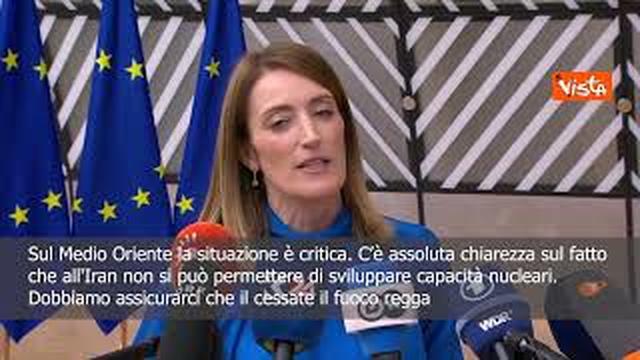 “Sul Medio Oriente, la situazione è critica. C’è un’ampia richiesta di de-escalation. C’è assoluta chiarezza sul fatto che all’Iran non si può permettere di sviluppare capacità nucleari. Dobbiamo assicurarci che il cessate il fuoco regga e dobbiamo anche lavorare per un cessate il fuoco a Gaza, affinché gli aiuti umanitari tanto necessari e vitali raggiungano tutti coloro che ne hanno disperatamente bisogno.”. Così la Presidente del Parlamento europeo Roberta Metsola a margine del Consiglio europeo