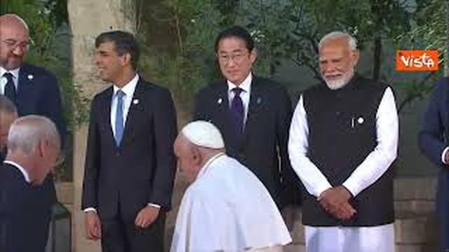 Papa Francesco, accompagnato da Giorgia Meloni, posa per la foto con i leader del G7 e le delegazioni ospiti al termine della sua partecipazione. Ecco le immagini. / Palazzo Chigi