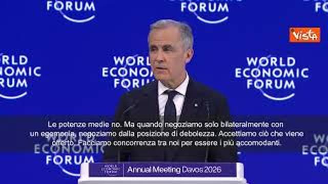 “Le potenze medie devono agire insieme perché se non siamo al tavolo, siamo nel menù. Le grandi potenze, per ora, possono permettersi di fare da sole. Hanno le dimensioni del mercato, la capacità militare e la capacità di dettare le condizioni. Le potenze medie no. Ma quando negoziamo solo bilateralmente con un egemonia, negoziamo dalla posizione di debolezza. Accettiamo ciò che viene offerto. Facciamo concorrenza tra noi per essere i più accomodanti. Questa non è sovranità. È l’esercizio della sovranità accettando la subordinazione. In un mondo di rivalità tra grandi potenze, i Paesi nel mezzo hanno una scelta. Competere tra loro per ottenere favori o combinarsi per creare un terzo percorso.”. Così il Primo ministro del Canada Mark Carney, intervenendo al Forum economico mondiale di Davos