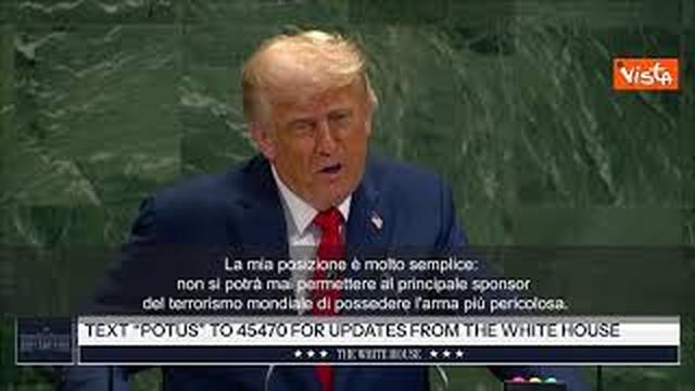 “La mia posizione è molto semplice: non si potrà mai permettere al principale sponsor del terrorismo mondiale di possedere l’arma più pericolosa. Invece di cedere alle richieste di riscatto di Hamas, coloro che vogliono la pace dovrebbero essere uniti da un messaggio: liberate gli ostaggi ora!”, lo ha detto il Presidente Usa Donald Trump all’assemblea dell’Onu.
