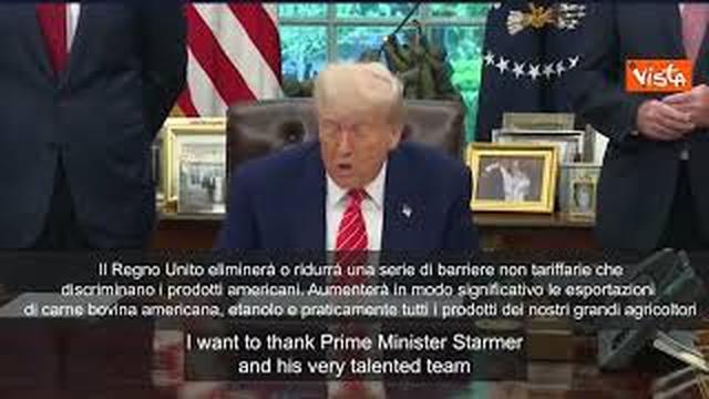 “Gli Stati Uniti e il Regno Unito hanno raggiunto uno straordinario accordo commerciale proprio nell’anniversario della vittoria della Seconda Guerra Mondiale, non c’è giorno migliore per annunciare questo accordo con uno dei nostri alleati più stretti. Il Regno Unito eliminerà o ridurrà una serie di barriere non tariffarie che discriminano i prodotti americani. Aumenterà in modo significativo le esportazioni di carne bovina americana, etanolo e praticamente tutti i prodotti dei nostri grandi agricoltori”, lo ha annunciato Trump alla Casa Bianca circondato dai suoi Ministri.