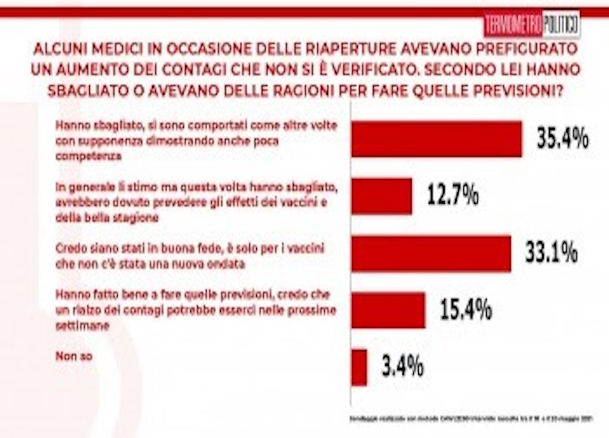 "Alcuni medici in occasione delle riaperture avevano prefigurato un aumento dei contagi che non si è verificato. Secondo lei hanno sagliato o avevano delle ragioni per fare quelle previsioni?". E' quanto ha chiesto Termometro Politico nel sondaggio settimanale.