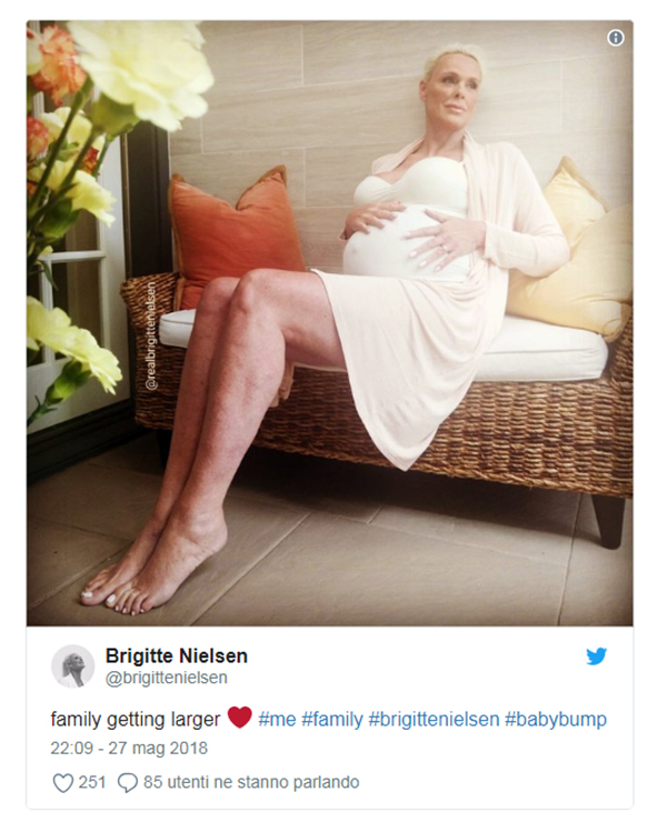 Brigitte Nielsen, attrice di origine danese e naturalizzata italiana, ha pubblicato su Instagram e Twitter uno scatto che la ritrae con un pancione: "La famiglia si allarga", scrive. L'immagine ha sollevato accese polemiche soprattutto in Germania: in molti hanno criticato la scelta di questa presunta gravidanza a 54 annia( a luglio saranno per lei 55 anni). Conferme ufficiali del bebè in arrivo, però, non sono ancora arrivate. E se si trattasse di una provocazione? Brigitte Nielsen è sposata dal 2006 con Mattia Dessì, italiano, classe 1978, con il quale l'attrice ha spesso affermato di desiderare un figlio. Per Brigitte Nielsen non sarebbe il primo figlio, ma il quinto: uno è nato dal primo marito Kasper Winding, due dall'ex compagno Mark Gastineau e uno dal terzo marito Raoul Meyer. Brigitte Nielsen è stata sposata anche con Sylvester Stallone, con il quale è di recente tornata sul set per "Creed 2".