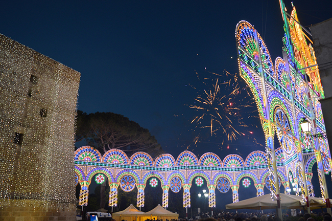 All’imbrunire si accendono le mille luci colorate delle luminarie, impalcature di legno che, con i loro ghirigori, si ispirano al barocco leccese. Le ditte del Salento sono uniche in Italia tant’è che vengono chiamate anche all’estero per decorare i centri commerciali e le grandi vie delle capitali europee e del mondo come Parigi, Hong Konk e Tokyo.