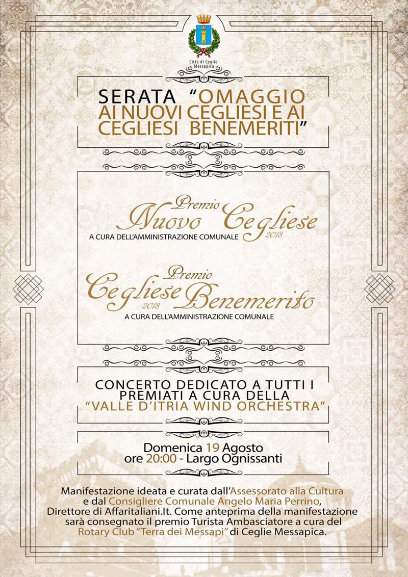 Sarà anche assegnato il premio “Cegliese Benemerito” 2018 a emigrati capaci di affermarsi lontano da casa, al Nord o all’estero, come Luciano Fedele (imprenditore dell’hotellerie a Milano e nel nord Italia, alla vigilia della sua quotazione in borsa) e ad Andrea Chirulli (imprenditore delle infrastrutture viarie e dei lavori pubblici in Italia e all’estero).