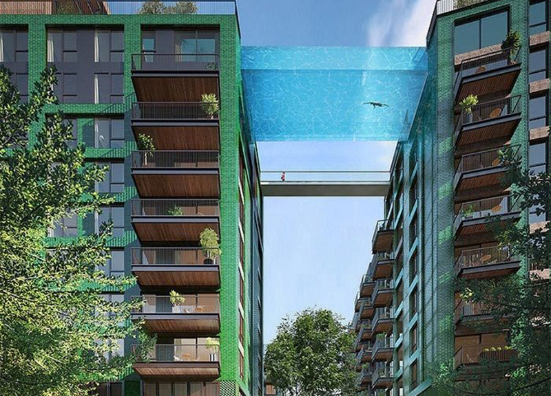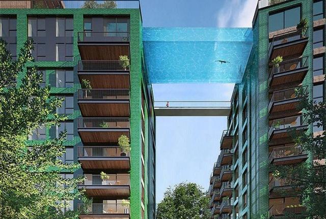 La "Skypool" di Londra è la prima piscina trasparente sospesa a 35 metri di altezza fra due condomini. E' stata finalmente completata e sarà inaugurata la primavera prossima. La vasca, realizzata in Colorado da un’azienda specializzata in acquari, è stata posizionata il mese scorso, e ormai è quasi pronta all'ingresso dei primi bagnanti.