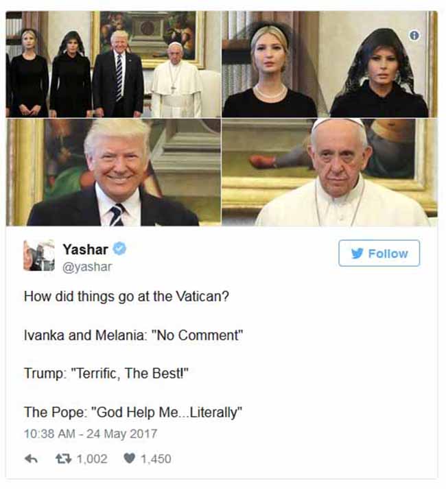 Papa Francesco non è sembrato troppo entusiasta della possibilità di farsi una foto ufficiale con Donald Trump. E ora questo incontro è diventato un tormentone sul web. Ecco alcuni dei meme e delle prese in giro più divertenti