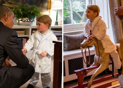 E' andata a ruba ed esaurita in pochi minuti la vestaglia con cui il principino George ha stretto la mano a Barack Obama e Michelle, andati a cena, venerdi' sera a Kensington Palace, residenza dei duchi di Cambridge, a Londra A prima vista la veste da camera sembra un accappatoio (e non si puo' immaginare una tale caduta di stile a Kensington Palace...). Ma le legioni di sudditi adoranti possono tirare un sospiro di sollievo: il FEMAIL Fashion Finder di Daily Mail - il prezioso 'monitor' con cui il popolare tabloid studia gli outfit delle celebrities e li ripropone (in versioni simili e a prezzi abbordabili)- ha identificato la vestaglia come uno dei prodotti in vendita su My1stYears, un sito specializzato in abiti e oggettistica per bambini, che possono anche essere personalizzati. La vestaglia e'' in soffice pile bianco, bordata di passamaneria a quadretti come il pigiamino, con tanto di nome ricamato, e costa 27 sterline. Gli Obama, dalla mattina a Londra, hanno cenato con i principi William ed Harry e la duchessa di Cambridge. A George e' stato concesso di stare 15 minuti con gli ospiti americani, mentre la sorella Charlotte era gia' a nanna. Negli attimi insieme, oltre a stringere la mano agli Obama, il piccolo ha sfoggiato alcuni suoi giocattoli: un cavallo a dandolo, che gli e' stato donato quando e' nato, e un cane-pelouche, che gli e' arrivato con la nascita di Charlotte. Erano entrambi regali degli Obama. Il cane e' la copia di Bo, il 'first dog', uno dei due cani portoghesi d'acqua che scorrazzano nei giardini della Casa Bianca.