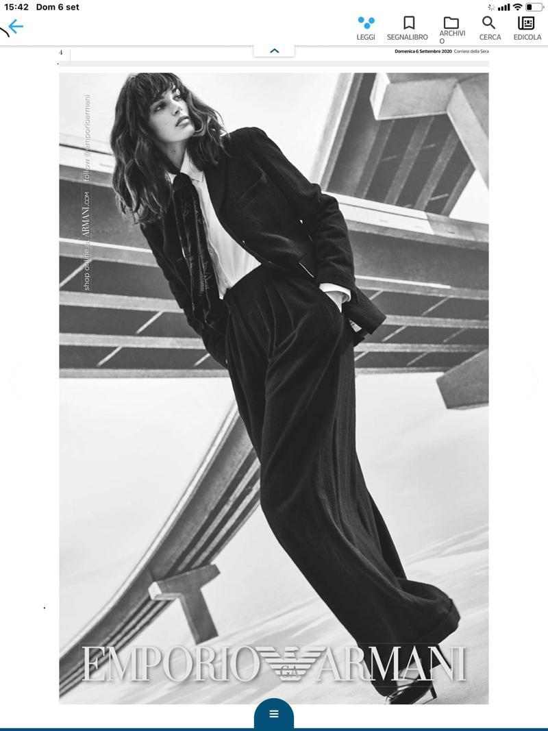 Questa pagina di Armani uscita oggi sui giornali (che ci riconcilia con lo stile, la classe, il buon gusto e pure con i canoni di una bellezza che non ha bisogno di essere spiegata) costituisce di per sé la dimostrazione che non esiste “la moda” – se non come settore – ma ne esistono le più diverse interpretazioni, che non è affatto detto rappresentino la società: avete mai visto per strada o al lavoro qualcun vestito con gli abiti delle sfilate, specie di quelle più osèe, tra cui possiamo annoverare quelle di Gucci? Peggio mi sento sentir definire gli stilisti come dei maitre à penser in grado di stabilire lo stile della società.