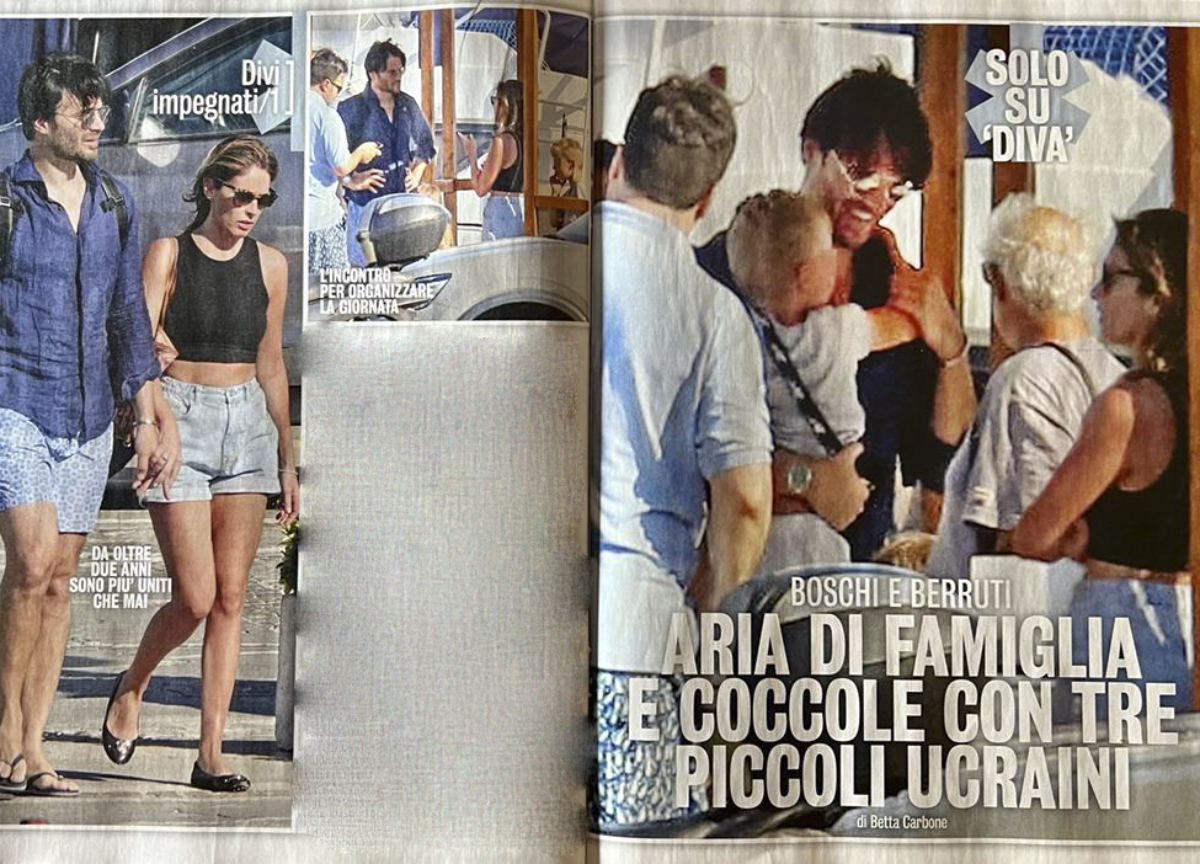 Ad attendere la deputata ed ex ministra e l'attore, c'è il fratello Gianluca Berruti, colonnello della Guardia di Finanza, in compagnia di tre bambini profughi, arrivatai dall'Ucraina. I piccoli sono stati accolti nella casa al mare della famiglia Berruti temporaneamente, dove si trovano in vacanza anche il padre, il chirurgo oculista Giuseppe Berruti e la madre Francesca Reggiani.