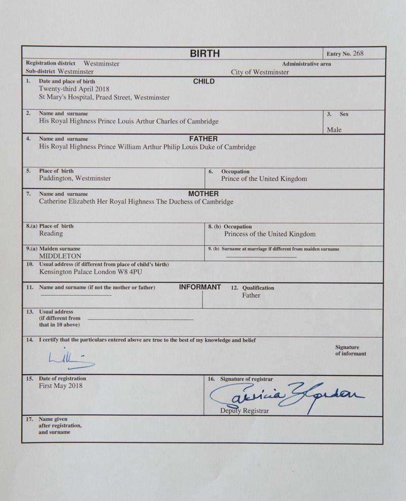 Il certificato di nascita del principe Louis ha rivelato ciò che il principe William e Kate Middleton fanno per lavoro. Il documento, che fissa il nome in “Sua Altezza Reale il Principe Louis Arthur Charles di Cambridge”, elenca i soliti dettagli come la data e il luogo di nascita del neonato. Ma sono le occupazioni elencate per il Duca e la Duchessa di Cambridge ad aver attirato l’attenzione dei media e dell’opinione pubblica mondiale, tra la sorpresa, l’ironia e le polemiche. William e Kate Middleton di lavoro fanno rispettivamente il “principe” e la “principessa del Regno Unito”.