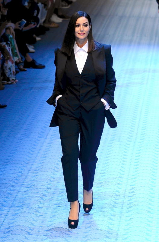 Monica Bellucci emerge da una pedana e apre la sfilata di Dolce & Gabbana a Milano in questa edizione di Milano Moda Uomo 2018. I due stilisti italiani lasciano tutti a bocca aperta, riportando Monica Bellucci in passerella dopo ben 26 anni, ovvero dal 1992 quando sfilò proprio per D&G. . Dopo di lei hanno fatto la loro apparizione in passerella anche due top legatissime alla maison e parte della storia della moda: Marpessa e Naomi Campbell, entrambe vestite con completi pantalone da uomo.