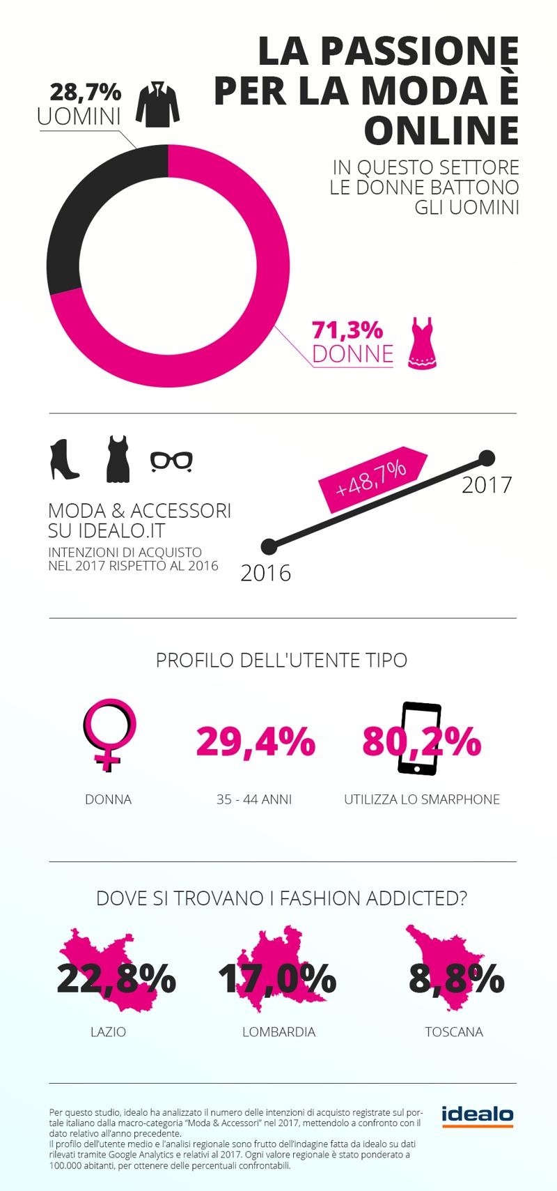 Saldi invernali, grandi manifestazioni internazionali, presentazione delle nuove collezioni. Nei primi mesi dell’anno si parla tanto, e in contesti diversi, di una delle grandi passioni del nostro paese: quella per l’abbigliamento e gli accessori. Da qualche tempo a questa parte, anche in questo ambito come in molti altri settori, il mondo online è diventato il canale privilegiato per informarsi e per acquistare. Pare addirittura che “abbigliamento e affini” sia uno dei primi settori dell’eCommerce italiano del 2017, secondo solo all’elettronica di consumo, con un valore di circa 2,5 miliardi e un incremento nel giro dell’ultimo anno del 28%. Ma come si comportano davvero gli utenti interessati a vestiti, scarpe, borse e simili? Al di là degli acquisti veri e propri, è dal mondo della comparazione prezzi che è possibile scoprire curiosità e tendenze degli utenti. Secondo il portale di comparazione prezzi idealo, ad esempio, l’attenzione dei consumatori digitali alla ricerca di informazioni, prezzi e opinioni sul tema registra oggi una crescita del 48,7% rispetto agli anni precedenti. Se il mondo eCommerce in generale viene considerato, numeri alla mano, territorio privilegiato degli uomini, quando si parla di moda le cose cambiano: l’utente tipo è una donna nel 71,3% dei casi (gli uomini sono al 28,7%); particolarmente interessata è la fascia di età dai 35 ai 44 anni (29,4%), seguita da quella dai 45 ai 54 (23,7%) e poi da quella delle più giovani, dai 25 ai 34 (20,1%). Le donne si dimostrano unite e al passo con i tempi, ben più degli uomini, anche per un altro dettaglio: la scelta di muoversi online sul tema usando lo smartphone (usato nell’80,2% dei casi); gli uomini, a parità di condizioni, lo usano sono nel 54% delle sessioni. Grazie ai dati analizzati da idealo, inoltre, si scopre dove si concentra la passione per la moda nel nostro paese: i “fashion addicted” più attivi online sono in Lazio (22,8%), in Lombardia (17%) e in Toscana (8,8%).