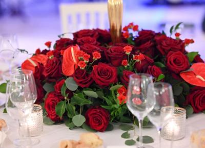 Le rose colombiane rosso porpora ornano i tavoli del Melograno di Monopoli