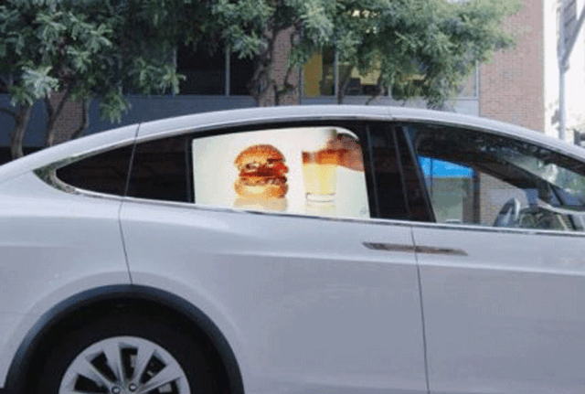 Grabb-it, azienda della California, in pratica trasforma il lunotto laterale di un'auto in un display a colori, riproducendo annunci in base alla posizione per chiunque si trovi in strada.