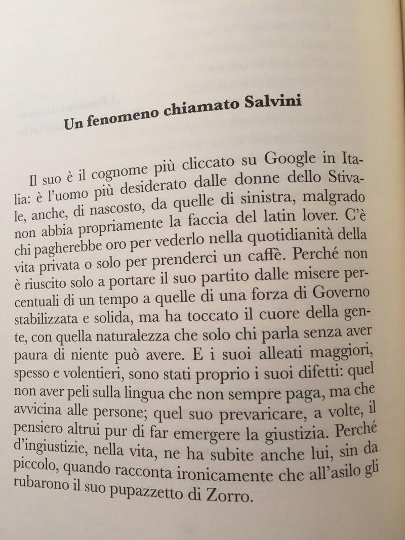 “Il più desiderato dalle donne dello Stivale, anche da quelle di sinistra. Vittima di perfide ingiustizie, come il furto di un pupazzetto di Zorro. Capace di toccare il cuore della gente. Capace di parlare senza aver paura di niente”. Questa l’introduzione al libro-intervista del “fenomeno chiamato Salvini” pubblicato dalla discussa casa editrice Altaforte del leader di CasaPound Francesco Polacchi, escluso dal Salone del Libro di Torino pochi giorni fa.
