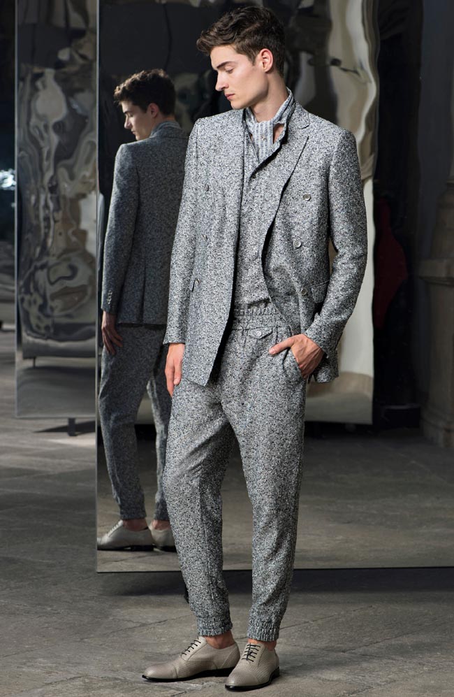 Anche la silhouette è spezzata a metà. Sopra giacca e gilet; sotto pantaloni da jogging. E` l’emblema dell’ossimoro dell’abito maschile di oggi: istituzione e ribellione, ordine e caos, impiego e tempo libero.