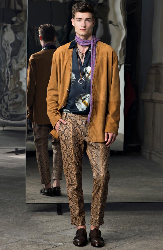 La personalità e la rilevanza dell’auto affermazione diventano il nuovo culto della mascolinità. In un momento di ridefinizione dei ruoli, la collezione Trussardi spinge sull’autorevolezza nel distinguersi. Stampe di busti classici con pennellate di colori primari si stagliano come quadri-a`-porter. E la pelle di pitone ritorna protagonista di un dandismo che non intende stupire ma aprire nuove strade nell’espressione della propria eleganza.