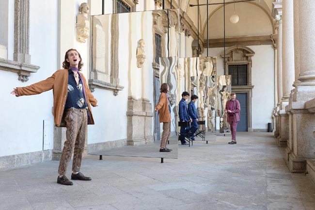 Quella di Gaia Trussardi è sempre più una fusione tra le arti. Nella presentazione della collezione uomo SS 2017 di ieri ha unito la sua creatività nella moda al teatro, alla letteratura, alla pittura e alla musica. Una fusione pirandelliana e contemporanea che si snodava nel tardo pomeriggio di ieri lungo un percorso suggestivo dentro la loggia del quadriportico di Palazzo di Brera. Protagonista l'uomo di oggi in bilico tra passato e presente, nostalgia e tecnologia, ruoli tradizionali e genderless.